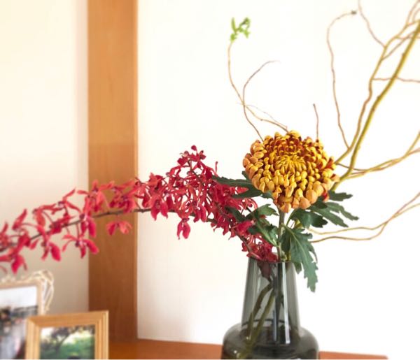 昨年秋(→★)にお迎えした枝に、菊と赤い蘭をプラスして。