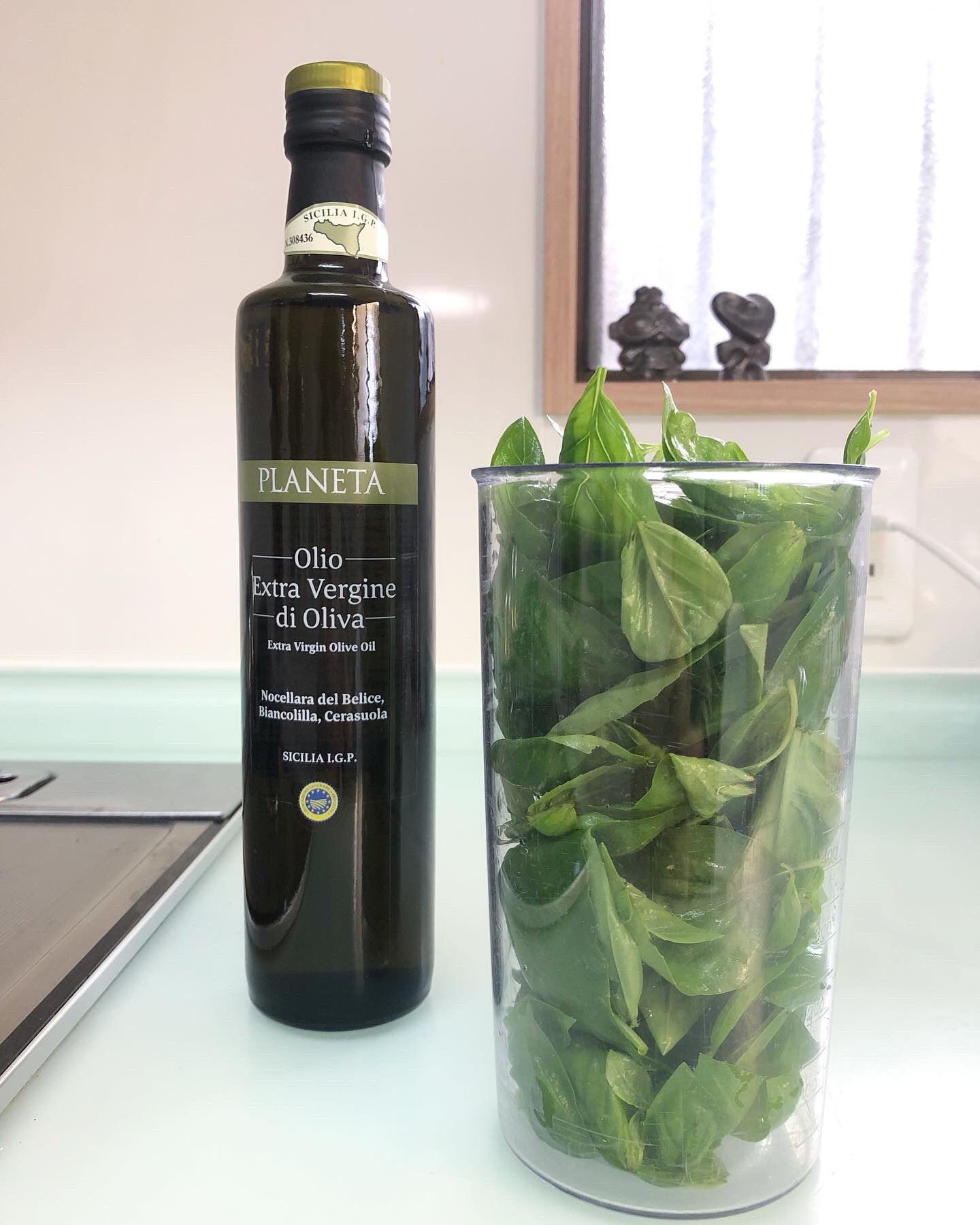 オリーブオイル、ニンニクと合わせてバジルソースを作りました。