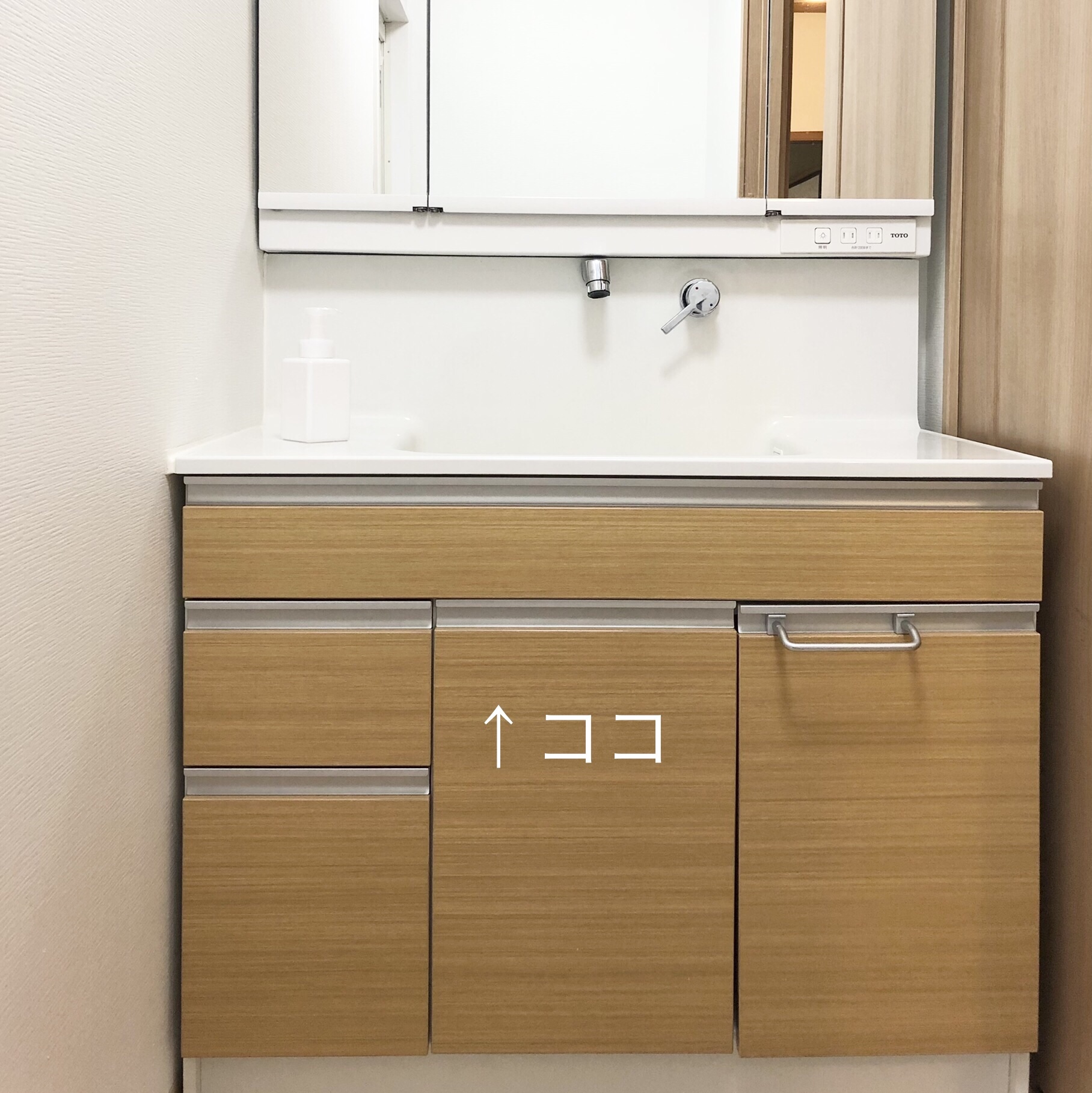 ヘアアイロンを置いた一番下の段は、いわばこの洗面台の一等地。
