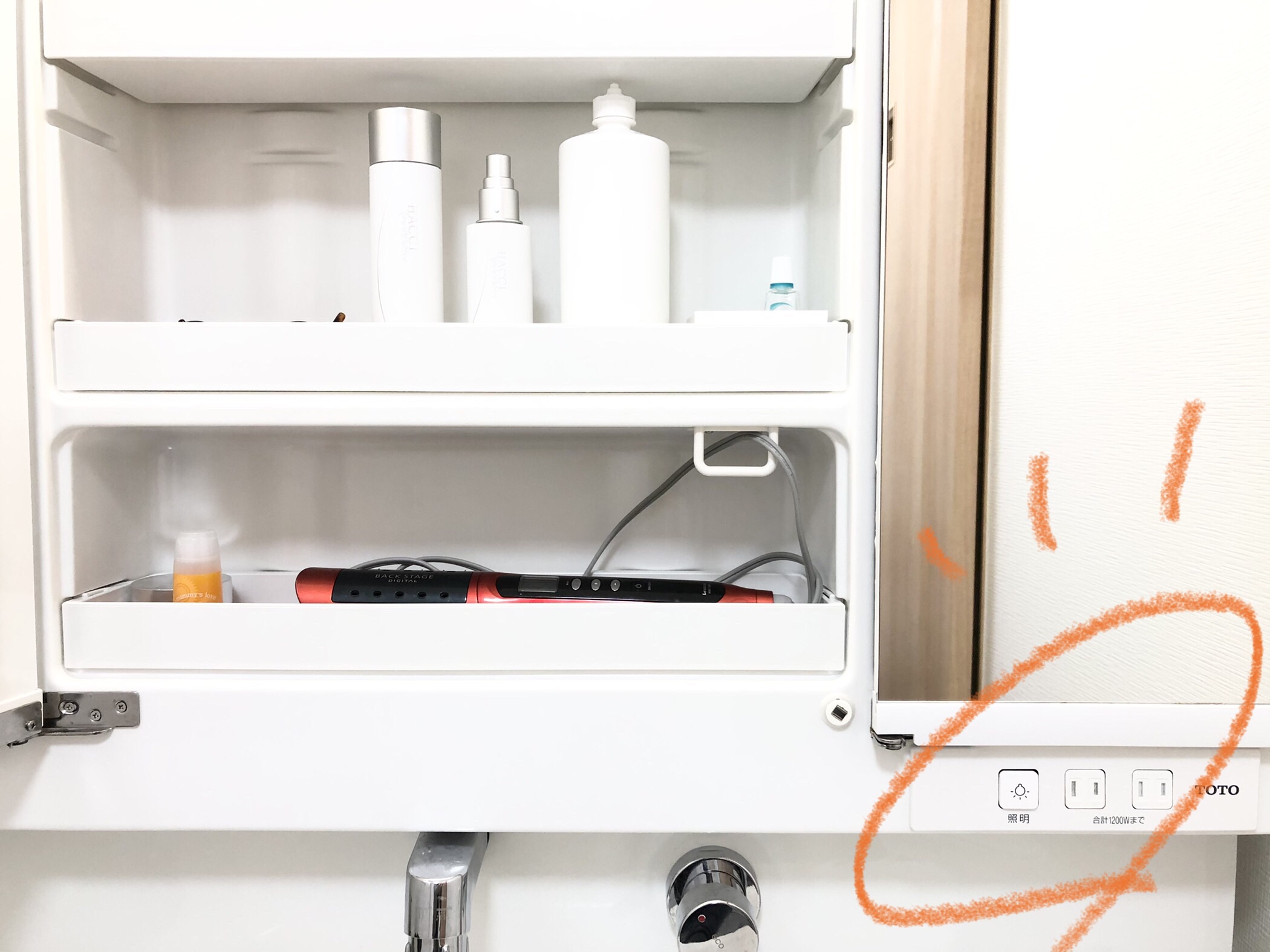 実は今までヘアアイロンは収納場所が決まっておらず、とりあえず下の扉の収納ボックスの隙間に入れていました。