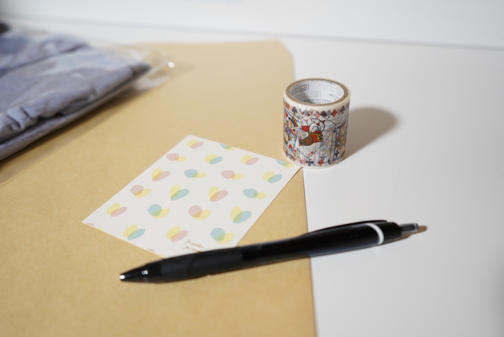 透明ビニール、角2サイズの封筒、メッセージカード、ボールペン、マスキングテープ。