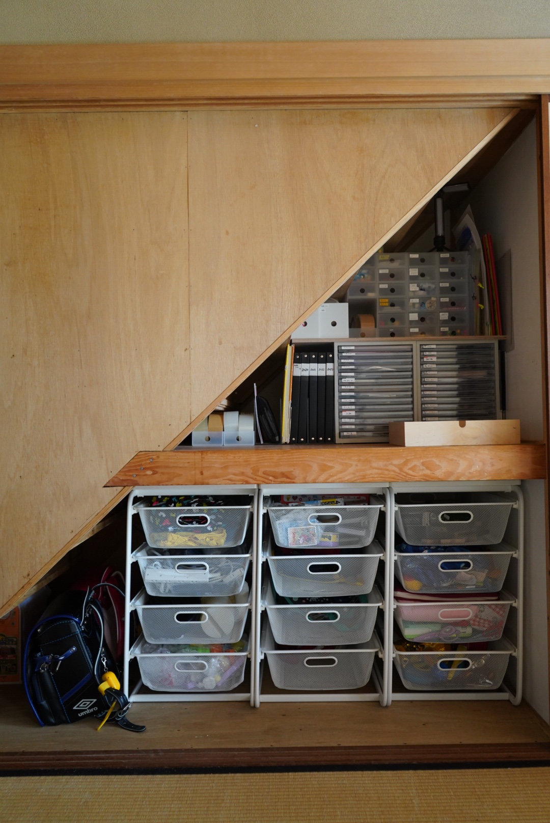 ↑こちらの押し入れで使っていたIKEAのバスケット収納を、階段下に移動させて使っています(^^)