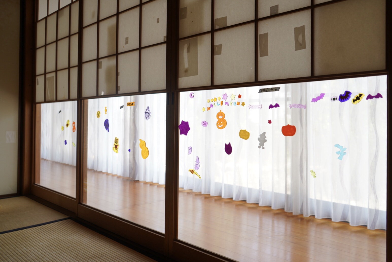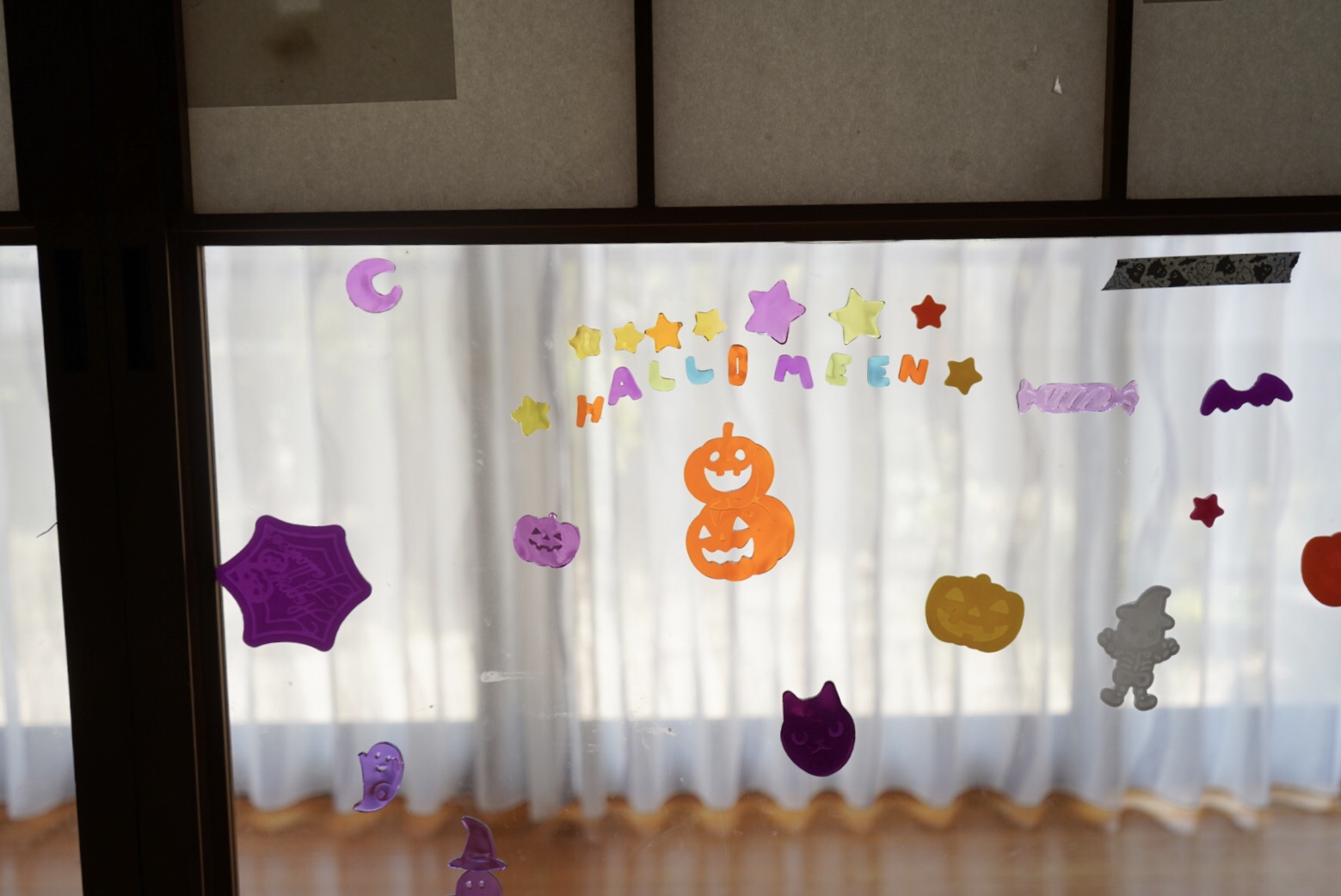 和室の障子を上げると出てくるガラス面に、100均のシールでデコレーション。