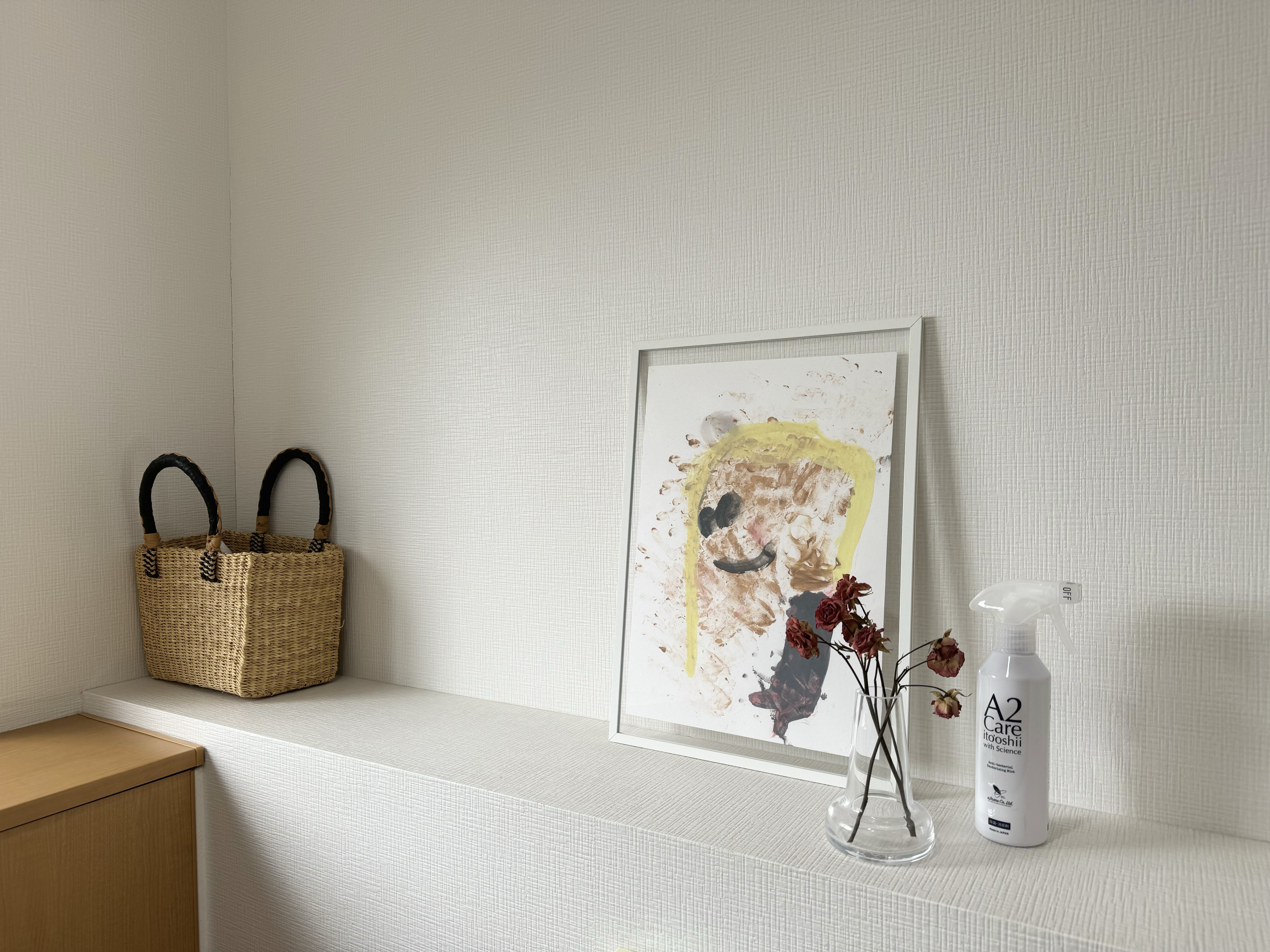 ハタキで埃を落として、壁と床をお掃除シートで拭き上げて、ピカーン!の写真。